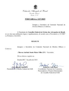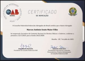O advogado paraibano Marcos Antônio Souto Maior Filho foi nomeado Secretário-Geral da Comissão Nacional de Direitos Difusos e Coletivos do Conselho Federal da Ordem dos Advogados do Brasil (OAB), com sede em Brasília-DF. A nomeação foi oficializada por meio da Portaria n. 1217/2025, assinada pelo presidente da OAB Nacional, Beto Simonetti, e pelo coordenador nacional de comissões, procuradorias e projetos estruturantes do Conselho Federal, Rafael Horn.